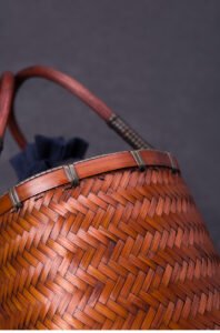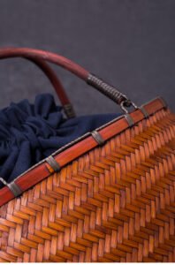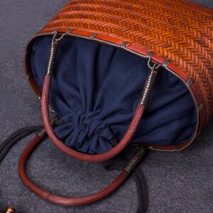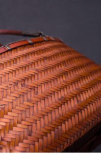 A perfect companion for tea ceremony enthusiasts, the main compartment comfortably accommodates tea bowls, tea trays, and other utensils, showcasing oriental elegance at teatimes. It’s also a versatile lifestyle accessory for urbanites, accommodating Japanese lunch boxes and other essentials for commuting or picnics. The vintage bamboo weaving blends seamlessly with modern styles, creating a uniquely artistic aesthetic. The strapless design enhances sleekness, creating a relaxed and poetic feel within the bag.