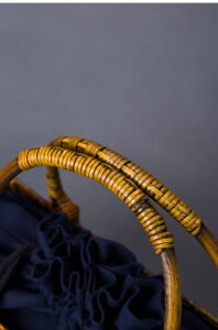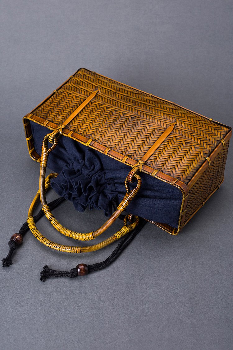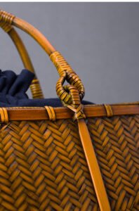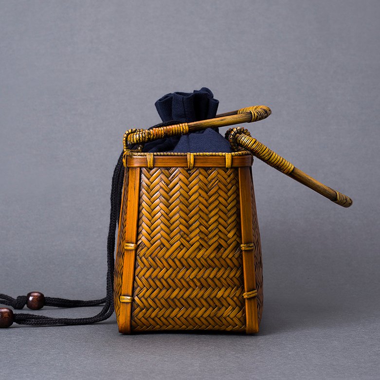 The bag’s rigid structure securely holds tea ceremony utensils, Japanese lunch boxes, and other items while retaining the inherent lightness of bamboo. The interior is lined with a soft, protective cotton material, and the drawstring closure is simple and practical, keeping out dust while allowing for quick access.